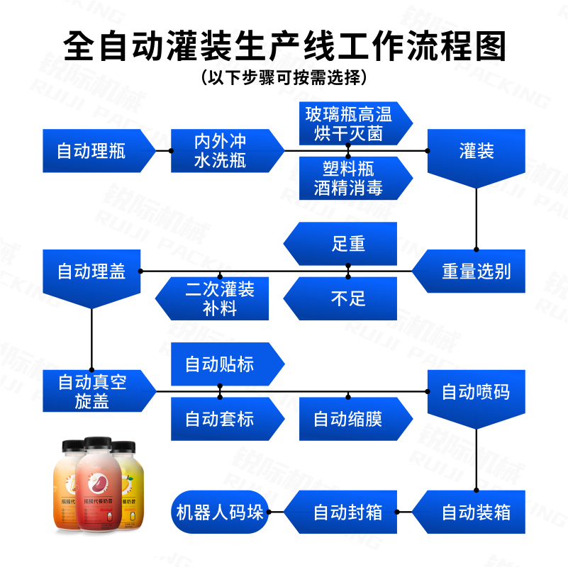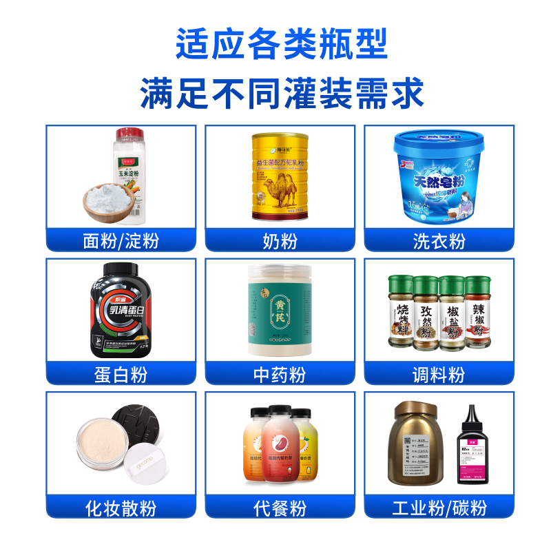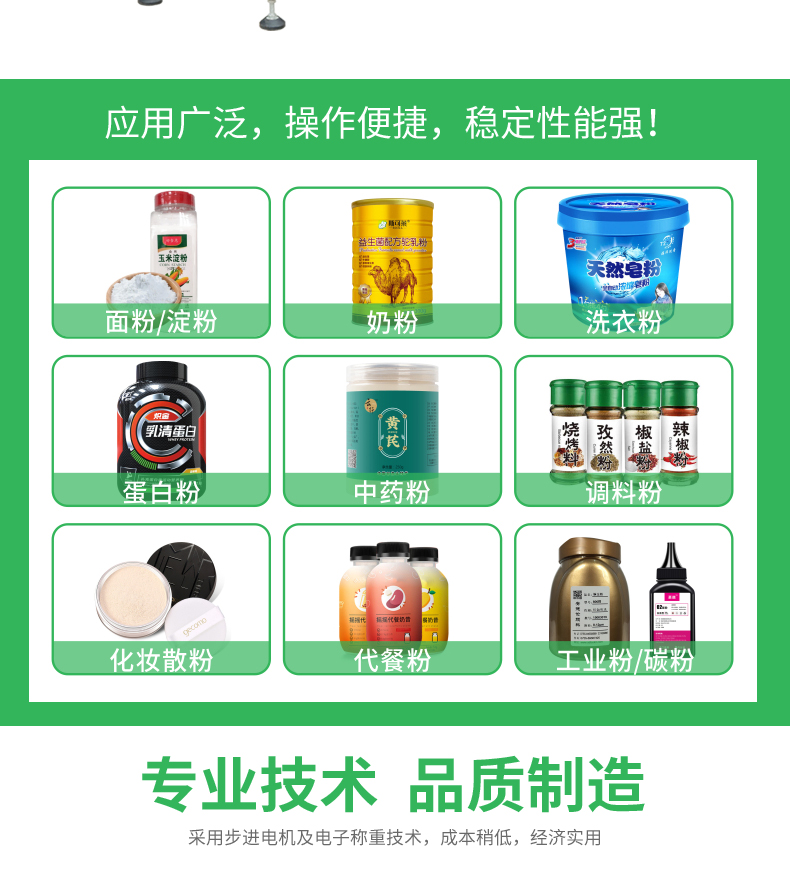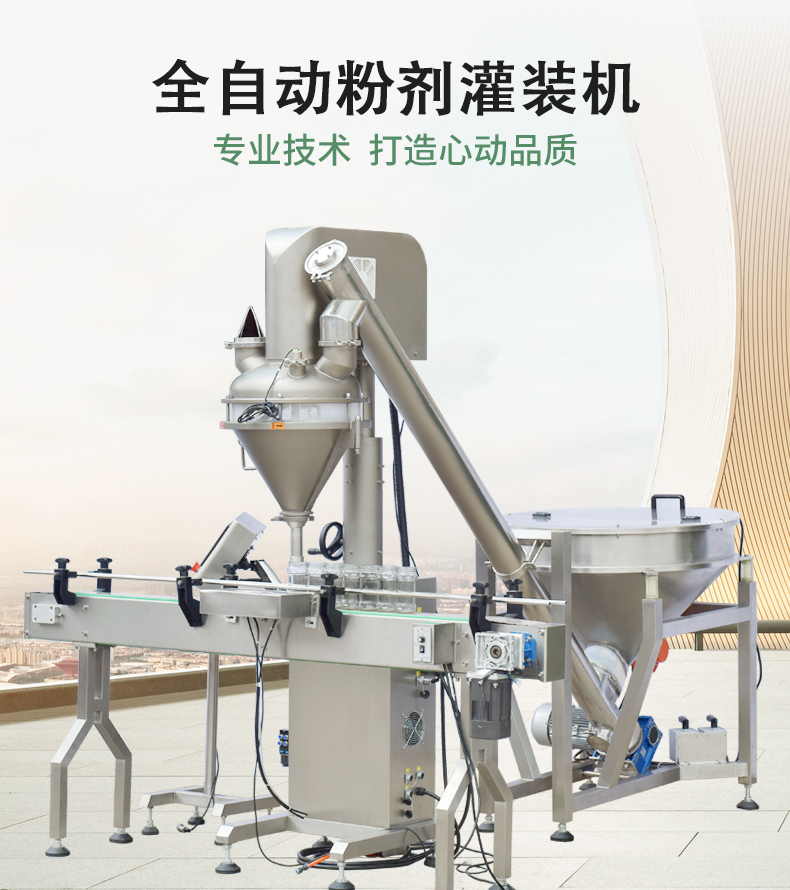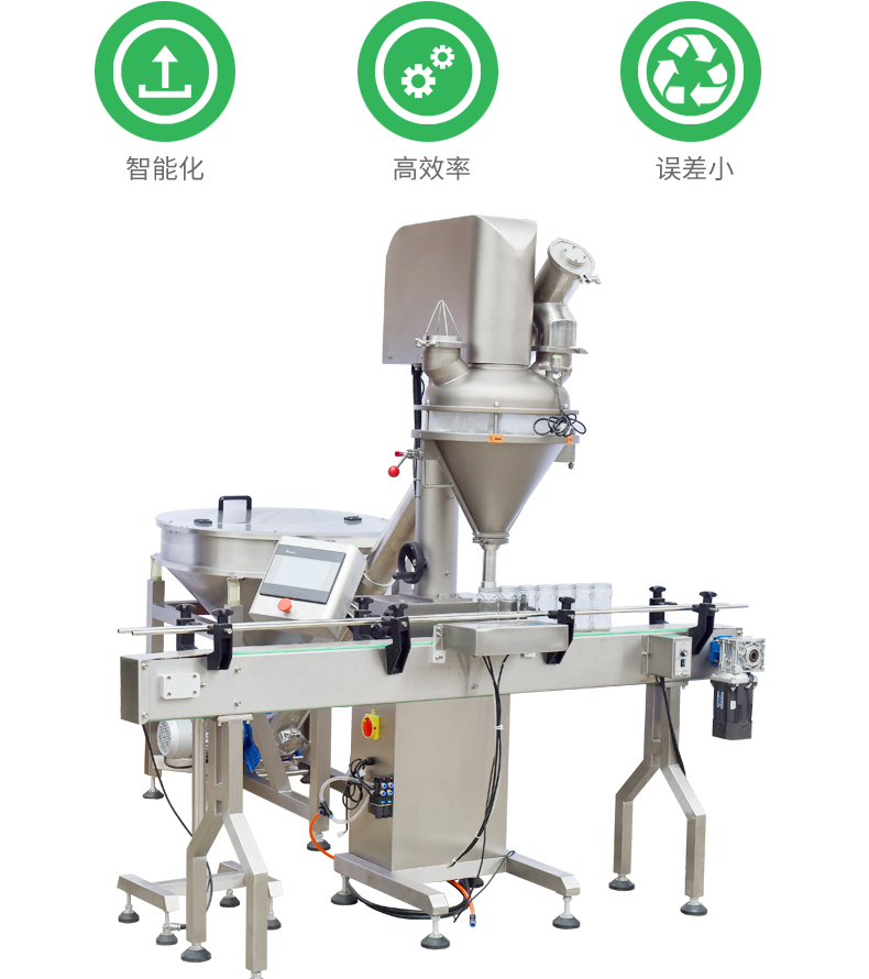 該機(jī)是一款經(jīng)濟(jì)實(shí)用的粉末及小顆粒自動(dòng)灌裝機(jī),能完成瓶子自動(dòng)定位、充填及計(jì)量等工作,它由理瓶機(jī)、螺桿計(jì)量機(jī)、旋蓋機(jī)、貼標(biāo)機(jī)、鏈板輸送帶及氣動(dòng)定位裝置組成整套灌裝流水線。