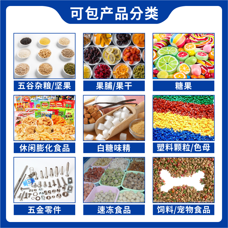 1.適用于各種PE罐、鋁合金罐 、紙罐等各種圓形規格以及特殊定制模具瓶型使用,針對顆粒產品自動定量灌裝生產。