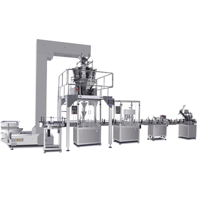 2.該套設備自動化程度高,整線聯動運行,符合GMP標準要求。機器自動理瓶,物料自動提升、稱重、入瓶、定位罐瓶、封蓋、貼標簽,生產日期打印等一系列生產環節均是自動化,無需人工參與。根據企業需求還可配套重量選別秤、干燥劑自動投包、瓶身除粉裝置、人工操作工作區、噴碼機、軟蓋自動封蓋、成品收集工作臺等輔助配套設備,進一步完善滿足生產需要。